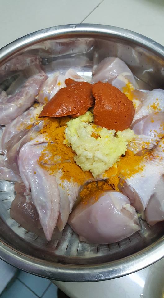 1. Perap ayam dengan garam, kunyit, halia ditumbuk lumat, pes cili (lebihkan jika suka pedas), dan kicap. Perap selama 15-30 minit agar rempah meresap.