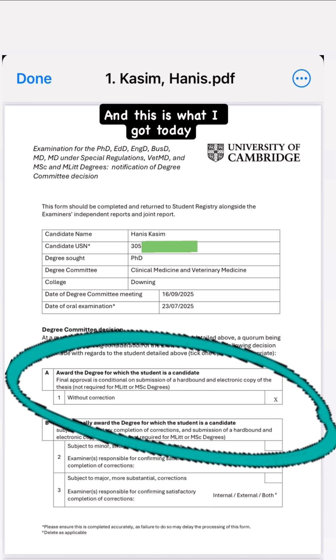 Keputusan ini bermakna tesis beliau dianggap sempurna oleh panel pemeriksa viva voce, tanpa perlu sebarang pindaan. Hanya segelintir graduan terpilih dari universiti terkemuka dunia yang pernah mencapai pencapaian ini.