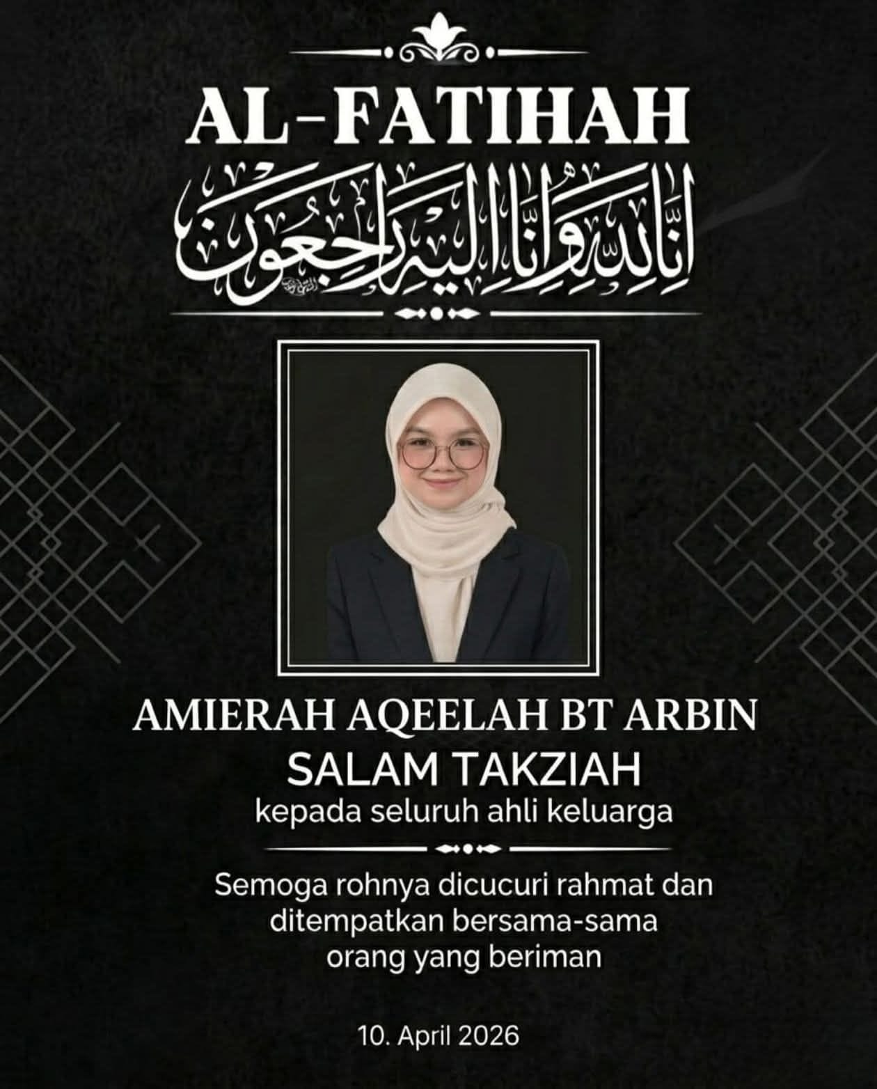 Mangsa dikenali sebagai Amierah Aqeelah Arbin, 25, yang juga merupakan penuntut tahun akhir di sebuah universiti.