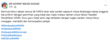 “Guru-guru tidak perlu lagi terbeban dengan tugas warden, hanya fokus mengajar, mendidik dan kemenjadian pelajar,” katanya menerusi hantaran di Facebook.